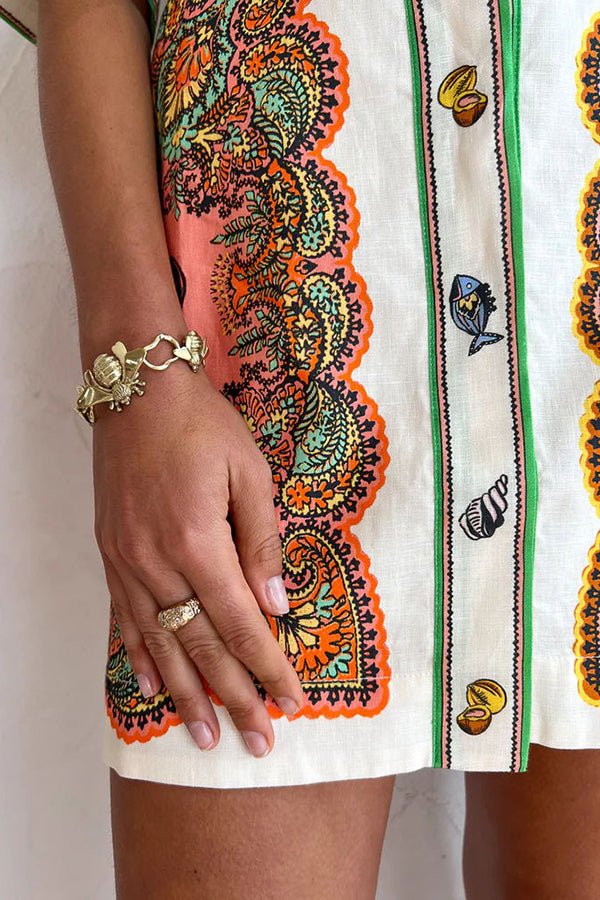 This exquisite shirtdress captivates with its ornate paisley patterns and vivid color palette. Crafted to feature a neat, pointed collar and short sleeves, this dress combines traditional charm with modern style. The straight-cut silhouette ensures a comfortable fit, while the intricate border detailing adds a touch of elegance.